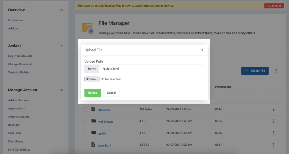 - Make sure you are in folder (Home / public_html), if you are in a different folder, navigate to the public_html folder