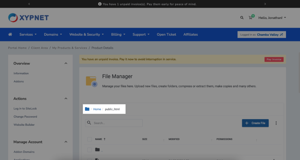 - If you still see the default XYPNET page, make sure to delete the index.html page which you will find by default in public_html