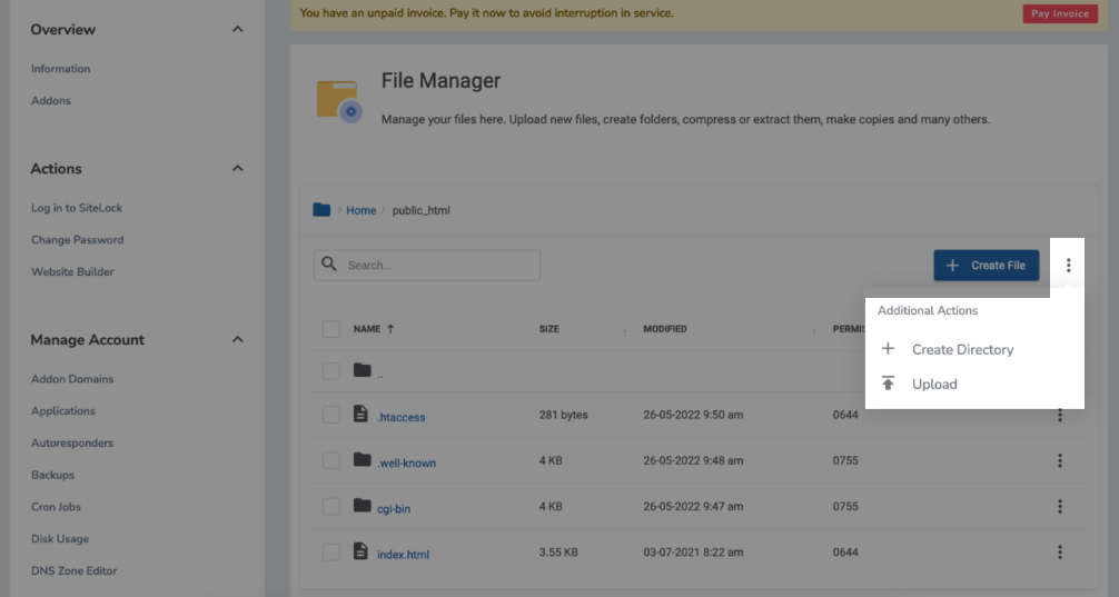 - In the public_html folder, click on "more actions" icon, then click upload (found on the right).